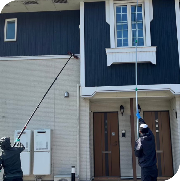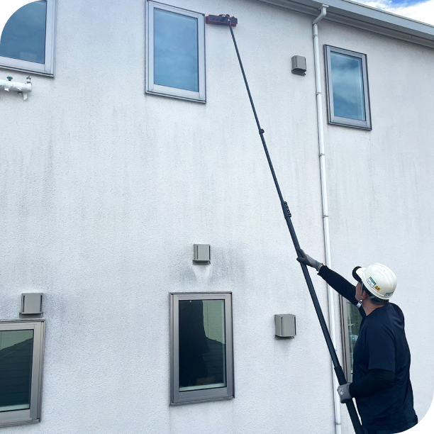 足場を使わず、高圧洗浄機も使わないこの工法は、お住まいの外壁を優しく洗い上げます。
